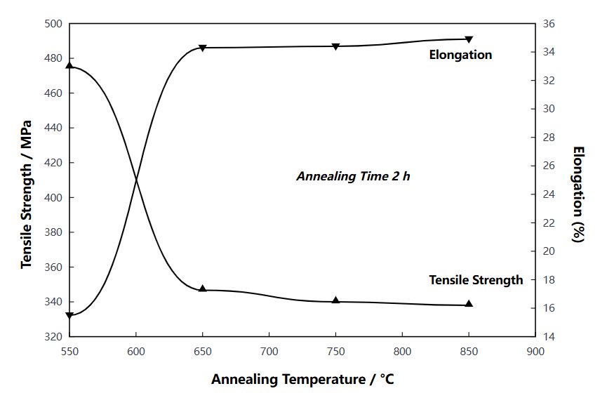 - Strength Decrease — As annealing temperature increases and time extends, tensile strength gradually decreases