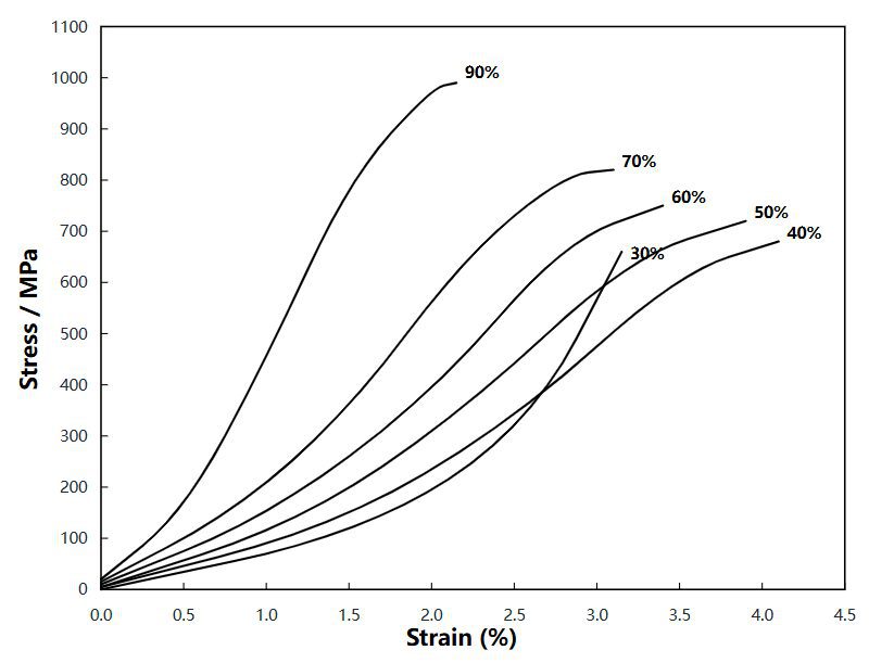 Figure 1: Stress-Strain Curves at Different Drawing Deformations (30%-90%). Y-axis: Stress (MPa), X-axis: Strain (%). The curves show that as deformation increases from 30% to 90%, tensile strength significantly increases from ~600 MPa to ~1000 MPa, while elongation decreases.